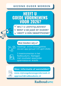 In deze studie onderzoeken we het effect van voedings- & beweegadvies in vergelijking met alleen beweegadvies via een handige app bij volwassenen van 60 jaar en ouder.